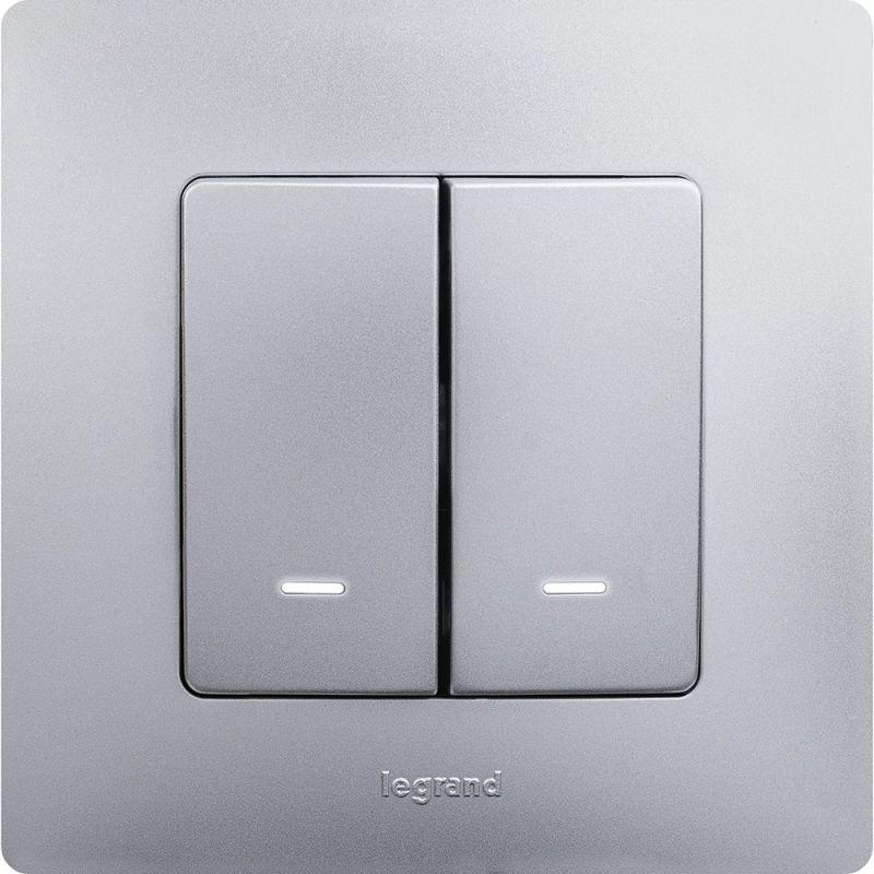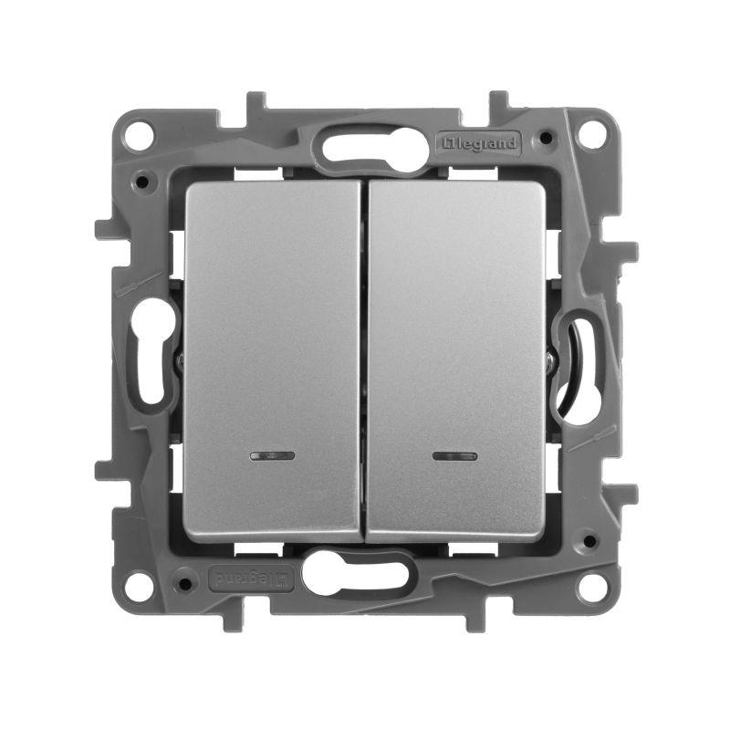 Выключатель 2-кл. СП Etika 10А IP20 250В 10AX с подсветкой/индикацией авт. зажимы механизм алюм. Leg 672404