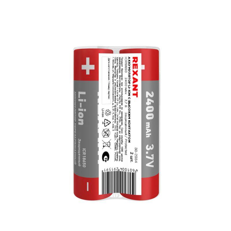 Аккумулятор Li-ion (литий-ион) 18650 3.7В 2400мАч с платой защиты (уп.2шт) Rexant 30-2034