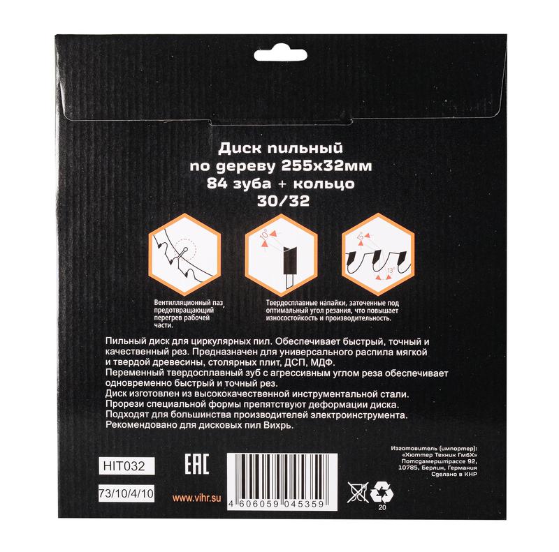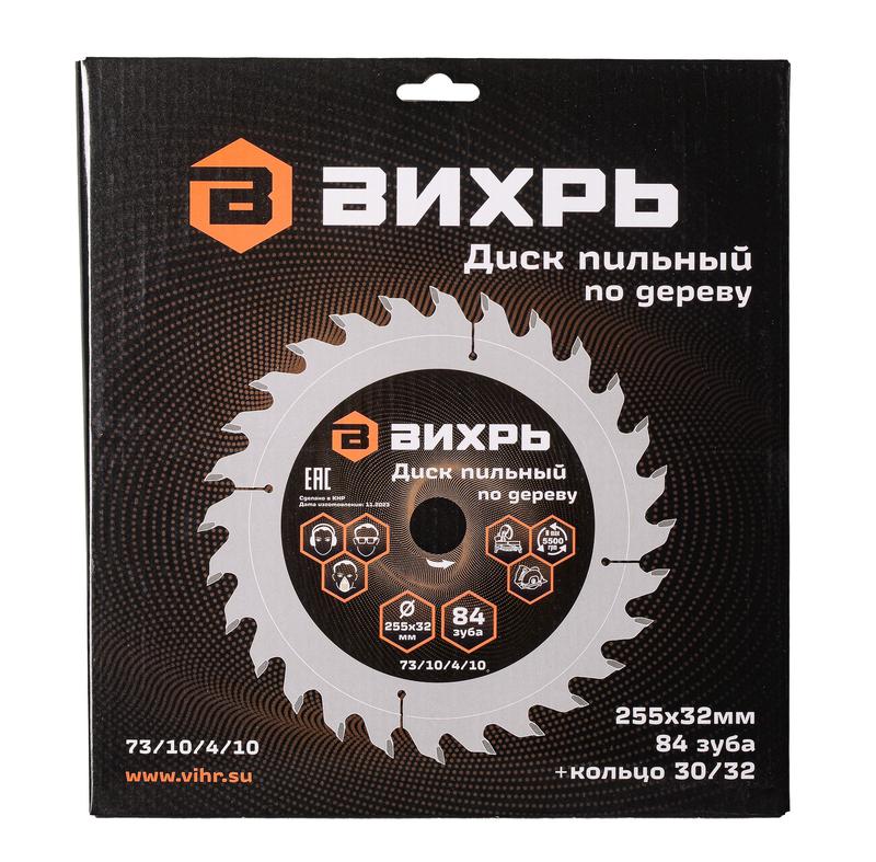 Диск пильный по дереву 255х32мм 84зуб. + кольцо 30/32 Вихрь 73/10/4/10