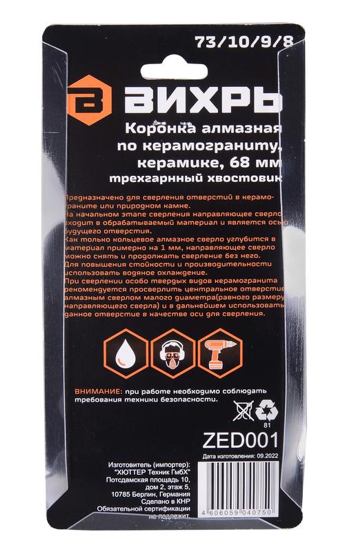 Коронка алмазная по керамограниту/керамике 68мм Вихрь 73/10/9/8