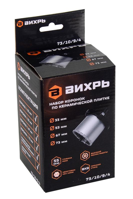 Набор коронок по керамической плитке 33-53-67-73мм Вихрь 73/10/9/4