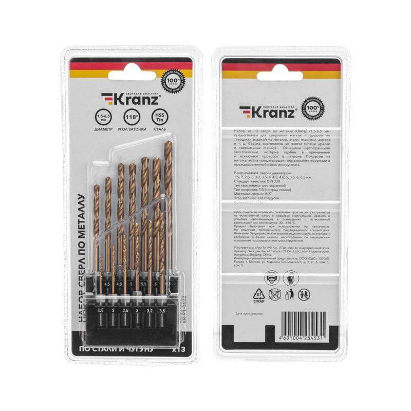 Набор сверл по металлу 1.5-6.5мм (через 0.5мм; 3.2мм; 4.8мм) HSS ТИТАН шестигранный хвостовик (уп.13шт) Kranz KR-91-0622