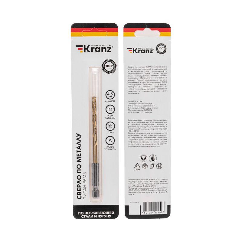 Сверло по металлу 4.5мм Р6М5 ТИТАН шестигранный хвостовик DIN 338 (уп.1шт) Kranz KR-91-5505