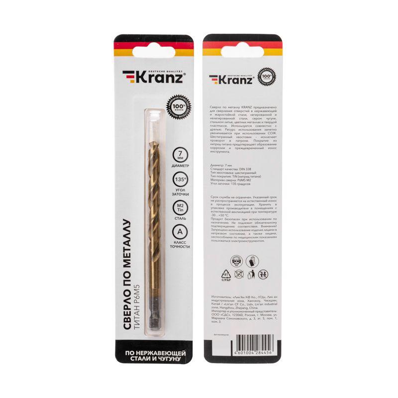 Сверло по металлу 7мм Р6М5 ТИТАН шестигранный хвостовик DIN 338 (уп.1шт) Kranz KR-91-5508