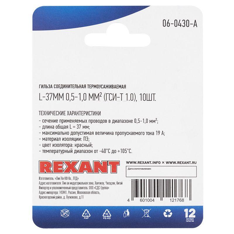 Гильза соединительная изолированная термоус. СГИ-т L-37мм 0.5-1кв.мм (ГСИ-т 1.0 / ГСИ-т 0.5-1.0 / KY-1) красн. (блист.10шт) Rexant 06-0430-A