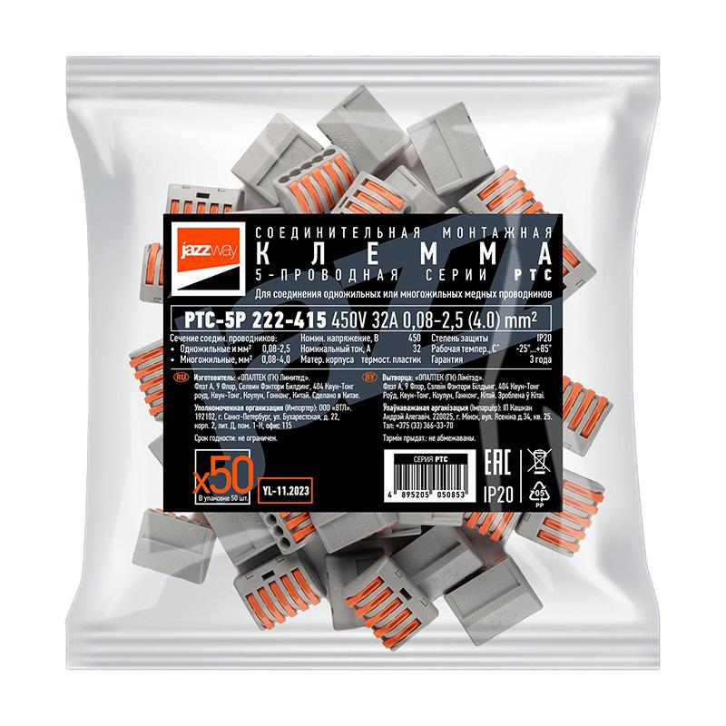 Клемма монтажная рычажного соединения PTC-5P 222-415 450В 32А 0.08-2.5(4.0)кв.мм Jazzway 5050853