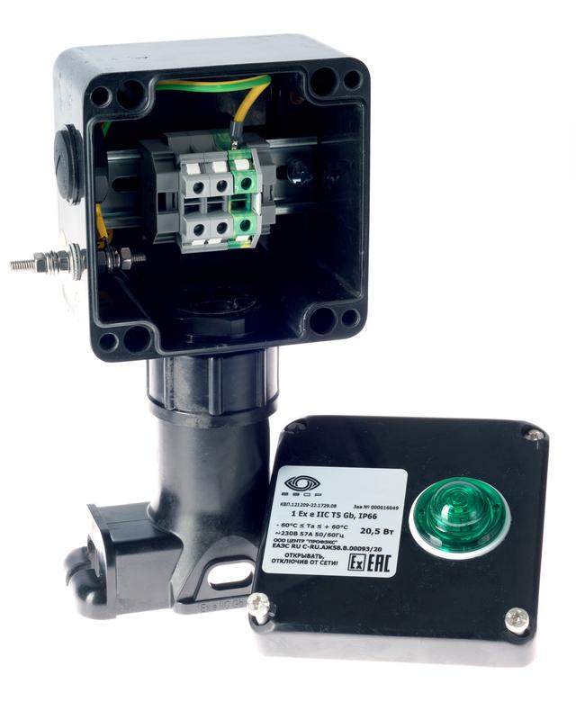 Коробка клеммная взрывозащ. с индикацией питания КВП на пластик. опоре для подключ. или концев. заделки нагреват. секции 1 отверст. под М25 клеммн. колодка 3мод. 10кв.мм Extherm sborka 1P/1L