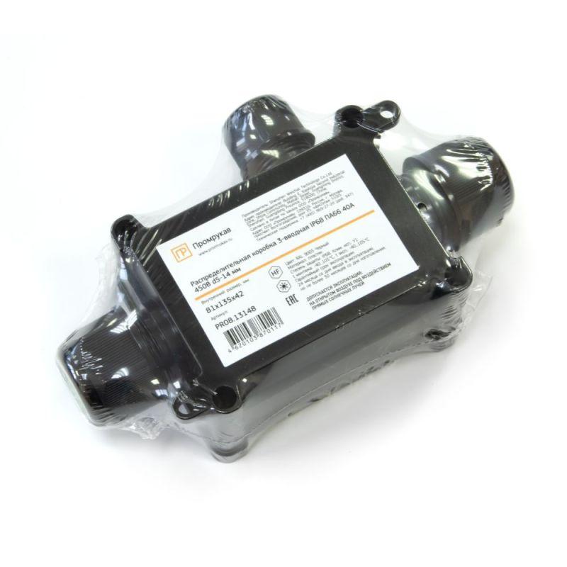 Коробка распределительная ОП 130х81х42 3-вводная IP68 ПА66 40А 450В d5-14мм черн. Промрукав PR08.13148