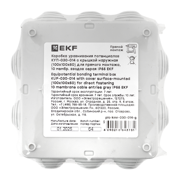 Коробка уравнивания потенциалов КУП-030-014 100х100х50 IP55 с крышкой наружн. для прямого монтажа 10 мембр. вводов сер. EKF plc-kmr-030-014-g