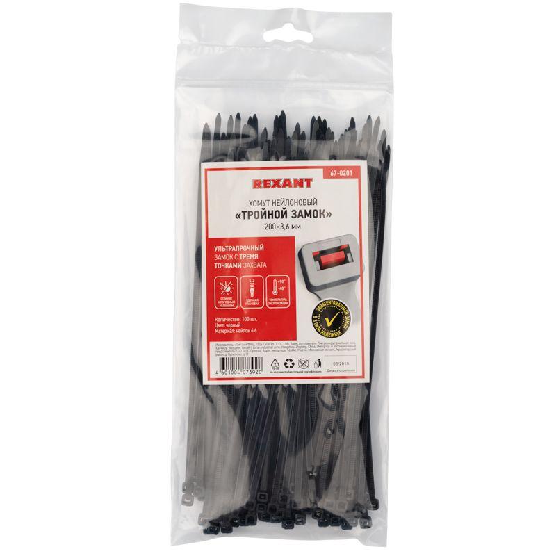 Хомут кабельный 3.6х200 тройной замок нейл. черн. (уп.100шт) Rexant 67-0201