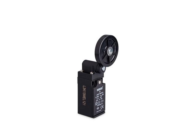 Выключатель концевой быстрого переключения угловой 2-х направленный с пластмас. консолью и резиновым роликом Ф50мм (1НО+1НЗ) EMAS L3K13MEL121