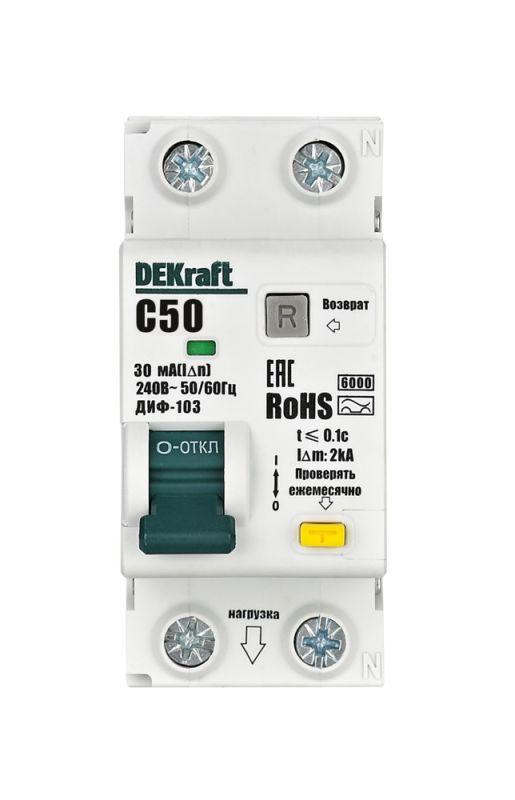 Выключатель автоматический дифференциального тока (АВДТ) 1P+N 50А 30мА A х-ка C ДИФ-103 6кА DEKraft 16352DEK