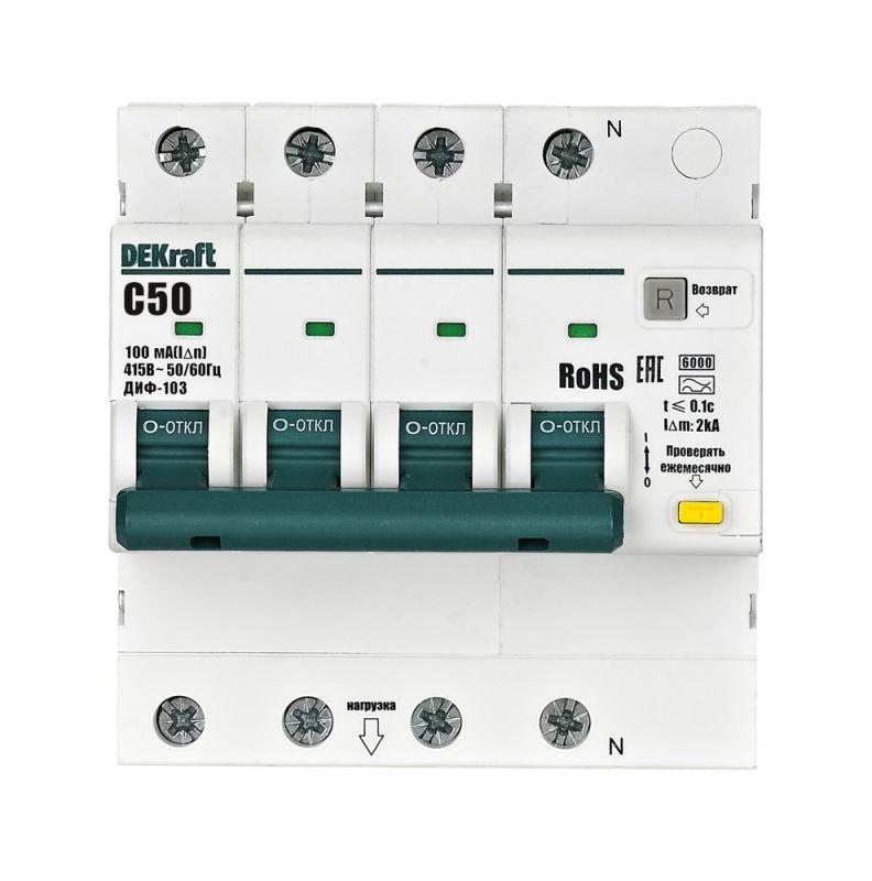 Выключатель автоматический дифференциального тока (АВДТ) 3P+N 50А 100мА AC х-ка C ДИФ-103 6кА DEKraft 16415DEK