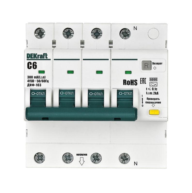 Выключатель автоматический дифференциального тока (АВДТ) 3P+N 6А 300мА A х-ка C ДИФ-103 6кА DEKraft 16444DEK