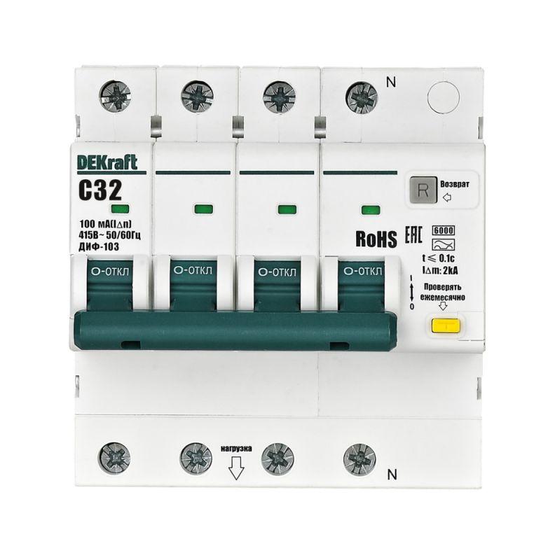 Выключатель автоматический дифференциального тока (АВДТ) 3P+N C 32А 100мА AC ДИФ-103 6кА DEKraft 16413DEK