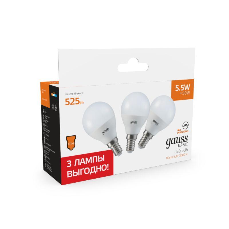 Лампа светодиодная Basic 5.5Вт шар 3000К E14 525лм (уп.3шт) GAUSS 10531152T