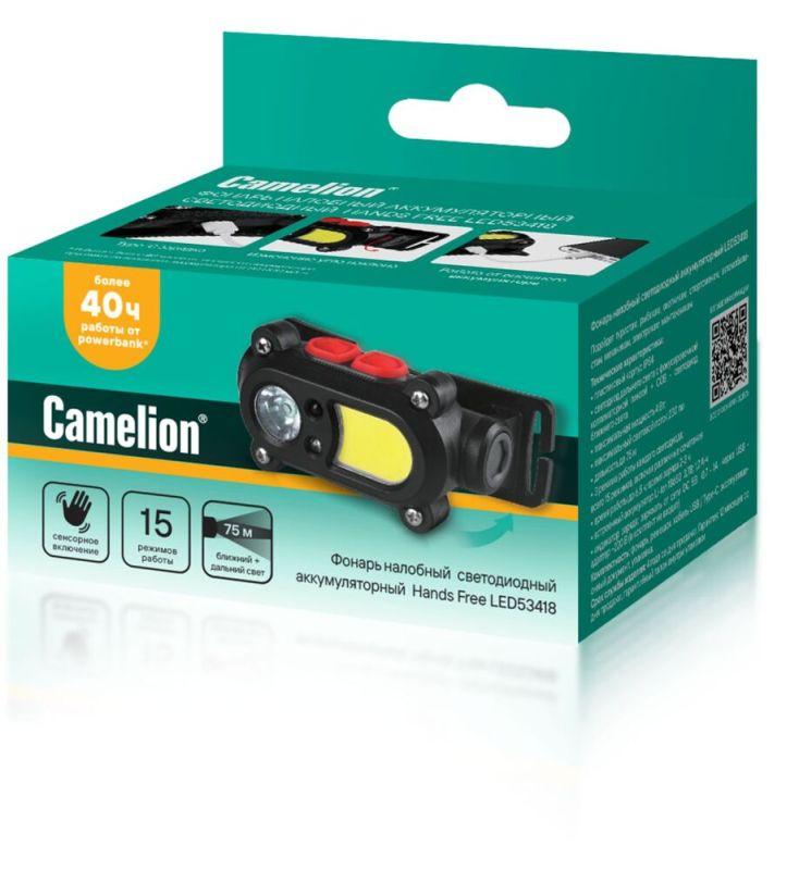 Фонарь аккумуляторный налобный 3.7В карбон 2 LED 3Вт 15 режимов сенсор MicroUSB бокс LED53418 Camelion 15746