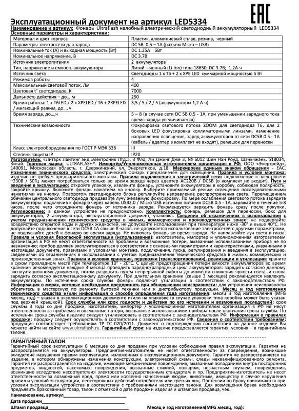 Фонарь налобный аккумуляторный LED5334 3.7В 3LED 5Вт фокус 2 ак. 4 реж. USB бокс черн. Ultraflash 15031