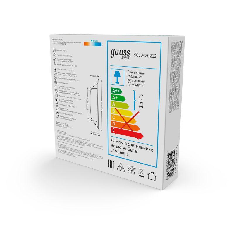 Светильник светодиодный Basic Downlight 12Вт 4000К IP20 1000m 170-260В 145х26 круг бел. GAUSS 9030420212