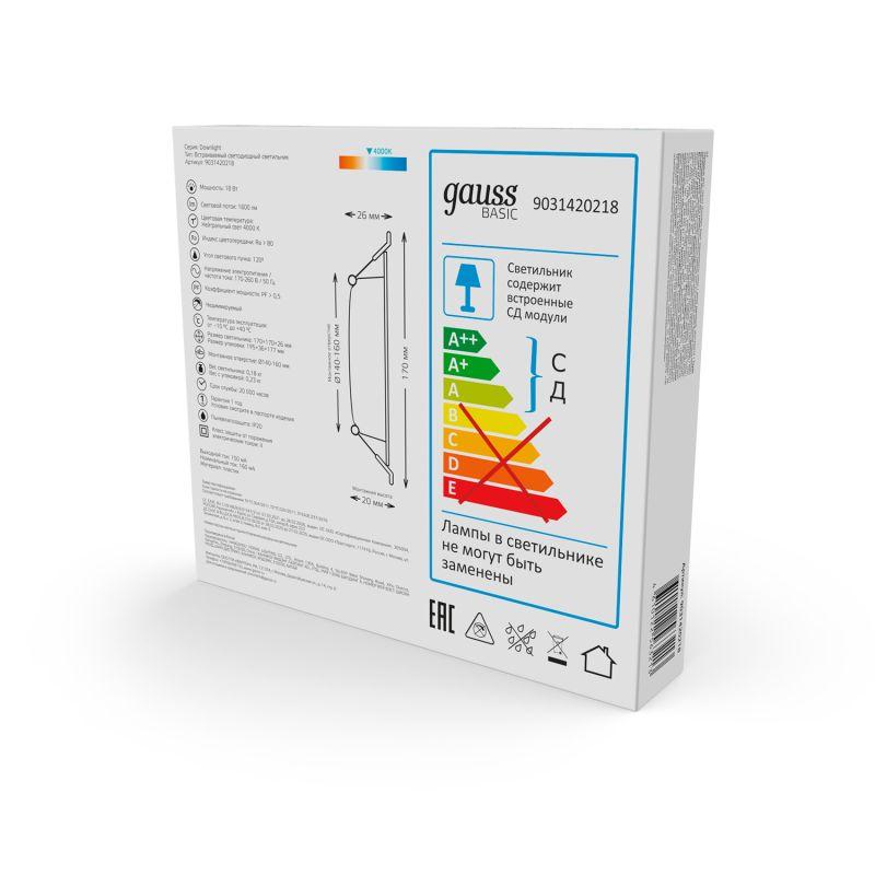 Светильник светодиодный Basic Downlight 18Вт 4000К IP20 1600лм 170х26 170-260В монтаж. квадрат бел. 1/60 GAUSS 9031420218