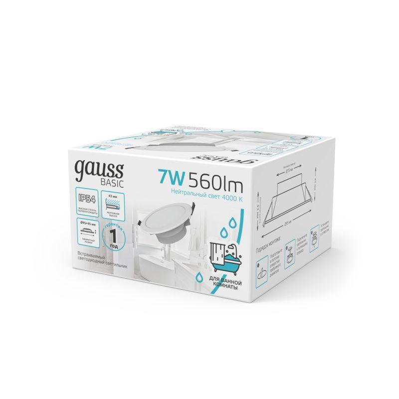 Светильник светодиодный Basic Downlight 7Вт 4000К IP54 560лм 185-250В 95х45 круг бел. GAUSS 9033420207
