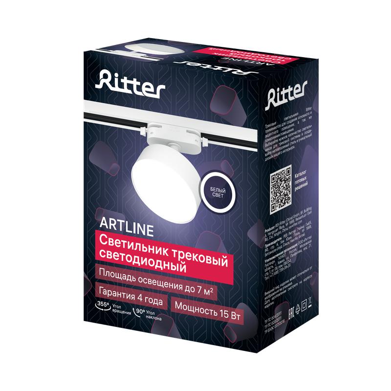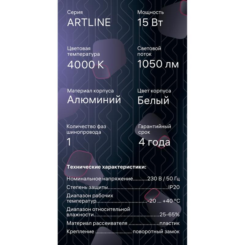 Светильник трековый светодиодный ARTLINE поворотный 95х95х30мм 15Вт 1050Лм 4000К 230В алюм. 7кв.м бел. Ritter 59723 4