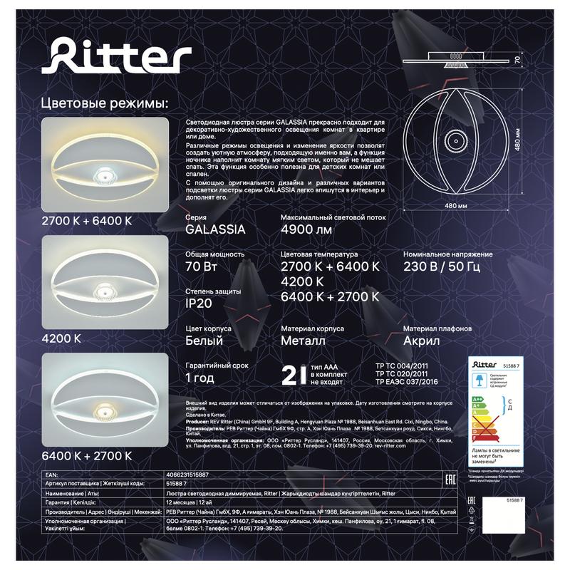 Люстра светодиодная OCCHIATA 70Вт 2700К+6400К/4200К/6400К+2700К 480х70мм 25кв.м ДУ 3 режима диммир. бел. Ritter 51588 7