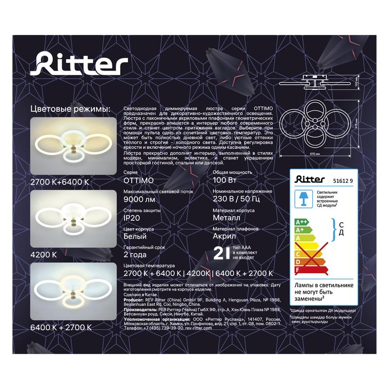 Люстра светодиодная OTTIMO Алиса 100Вт 2700К+6400К/4200К/6400К+2700К 615х415х130мм 45кв.м ДУ диммир. бел./зел. Ritter 51612 9