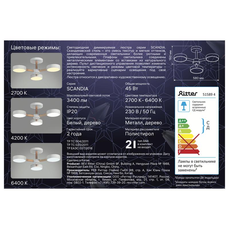 Люстра светодиодная SCANDIA 45Вт 2700К/4200К/6400К 580х160мм 17кв.м ДУ 3 режима диммир. бел./дерево Ritter 51589 4