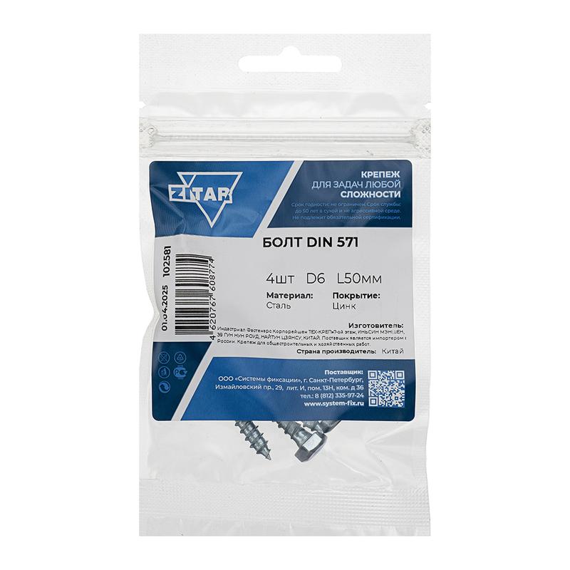 Болт сантехнический 6х50 DIN 571 оцинк. (уп.4шт) Tech-Krep/Zitar 102581