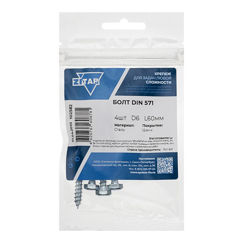 Болт сантехнический 6х60 DIN 571 оцинк. (уп.4шт) Tech-Krep/Zitar 102582