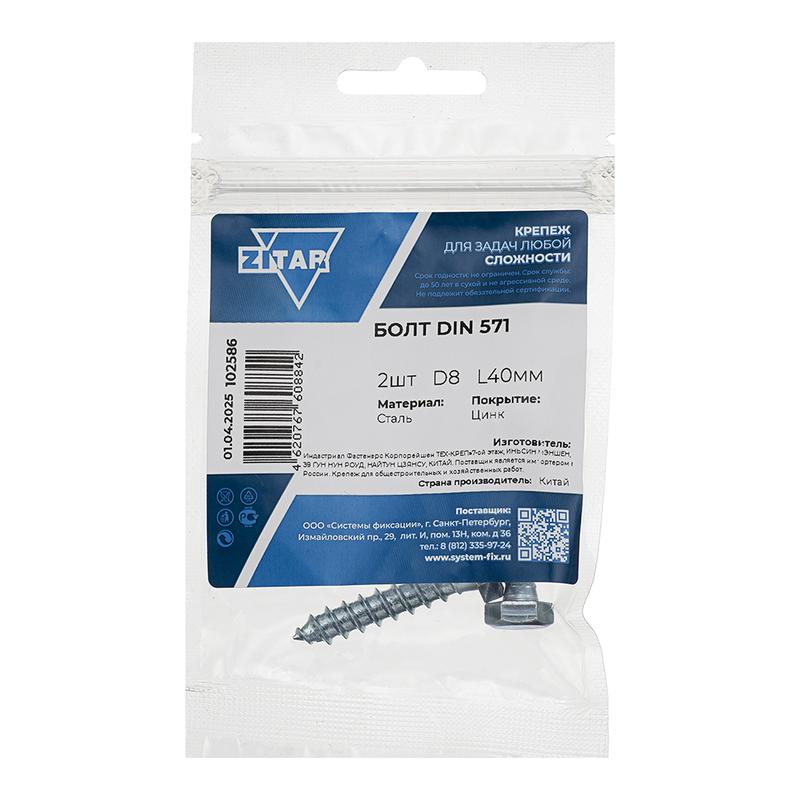 Болт сантехнический 8х40 DIN 571 оцинк. (уп.2шт) Tech-Krep/Zitar 102586