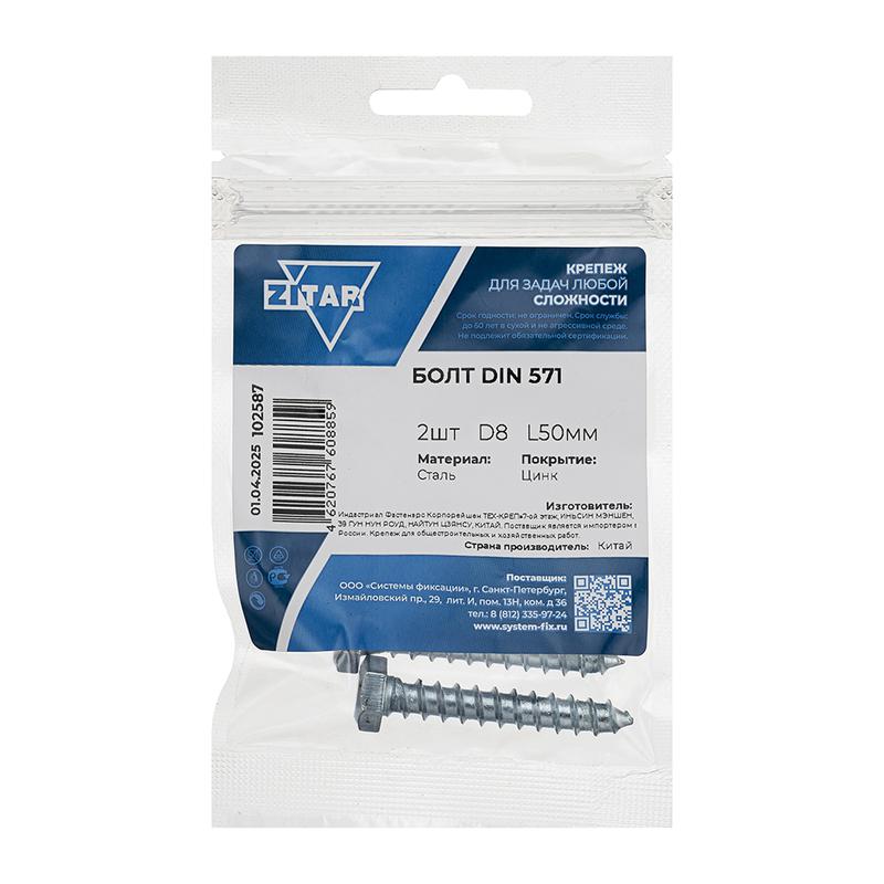 Болт сантехнический 8х50 DIN 571 оцинк. (уп.2шт) Tech-Krep/Zitar 102587