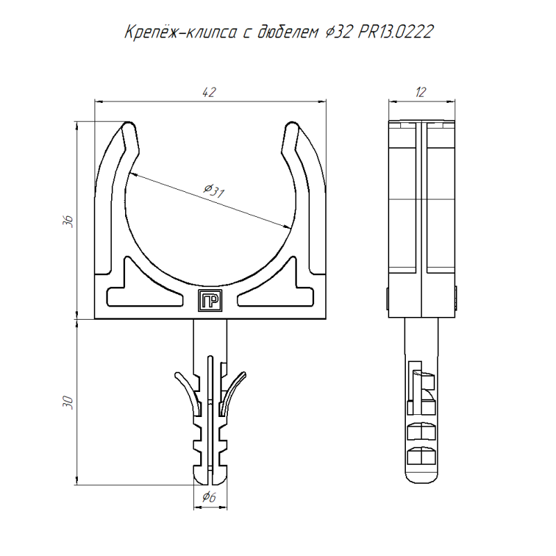 Держатель для труб (клипса) d32мм с дюбелем и саморезом черн. (уп.25шт) Промрукав PR13.0222