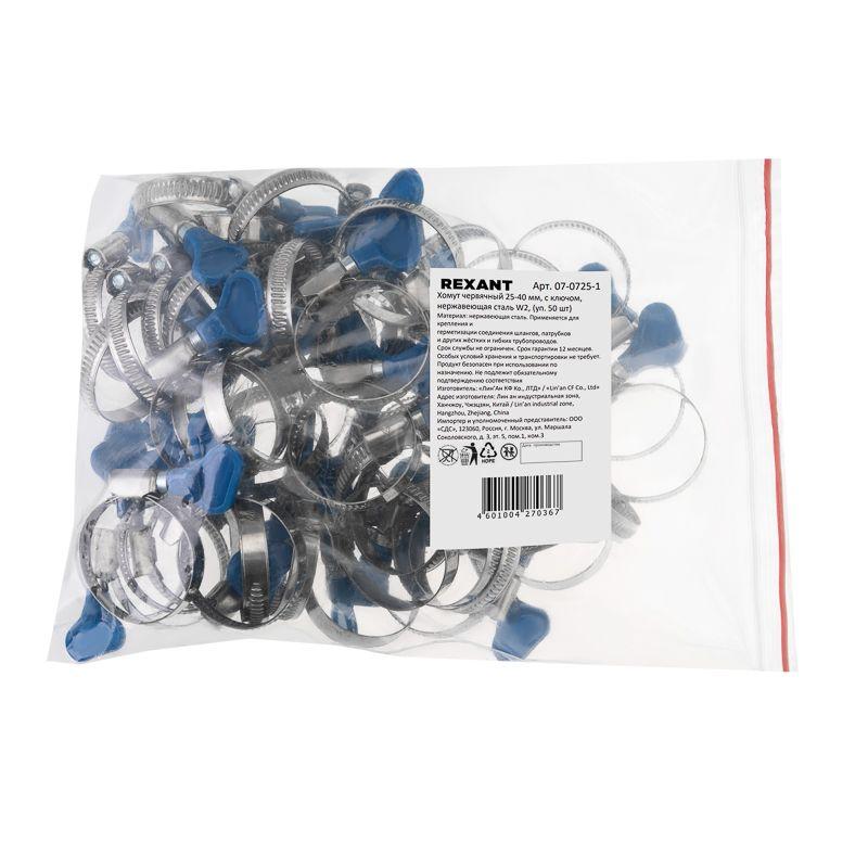Хомут червячный 25-40/9-0.7мм с ключом нержавеющая сталь W2 (уп.50шт) Rexant 07-0725-1