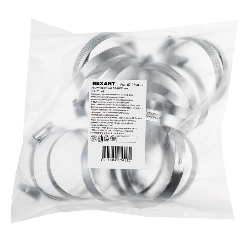 Хомут червячный 50-70/12-0.8мм (уп.25шт) Rexant 07-0650-12