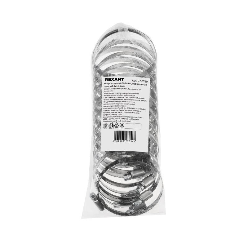 Хомут червячный 60-80/9-0.6мм нержавеющая сталь W2 (уп.25шт) Rexant 07-0760