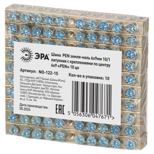 Шина NO-122-15 PEN "земля-ноль" 6х9мм 10/1 с креплениями по центру латунь ЭРА Б0047229